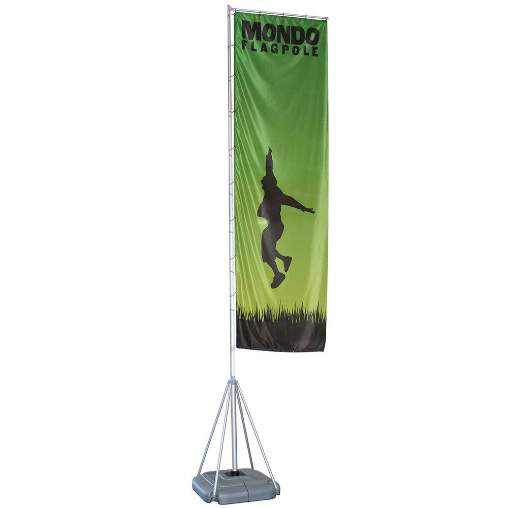 This 17ft Mondo Flagpole banner stand comes with a single-sided custom print, stand and water base. A fresh, new design of the giant pole, the Mondo flagpole is ideal for outdoor events, conference, sport events, etc. The banner design is customized to your graphic artwork, and is printed on a polyester-blend mesh fabric material by the process of dye sublimation. Our inks heavily saturate the material to create a "bleed-through" effect for our single-sided displays such as this one. The telescopic aluminum flagpole fits into a plastic base that can be filled with water for stability. The flag is held with rings. Mondo flagpoles are easy to handle and install.