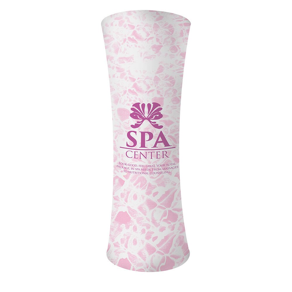 This display is very lightweight and is an excellent attention grabber due to its sheer size. The aluminum frame is easily assembled by snapping all of the individual tubes together. The graphic slides over the frame, pulled down until taut, and then is zipped closed. A durable case with wheels for easy transport is included.