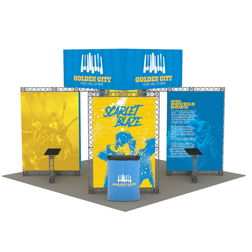 - Designed to fit in a 20ft x 10ft booth space. Please check your trade show guidelines to make sure this configuration conforms to the show regulations.