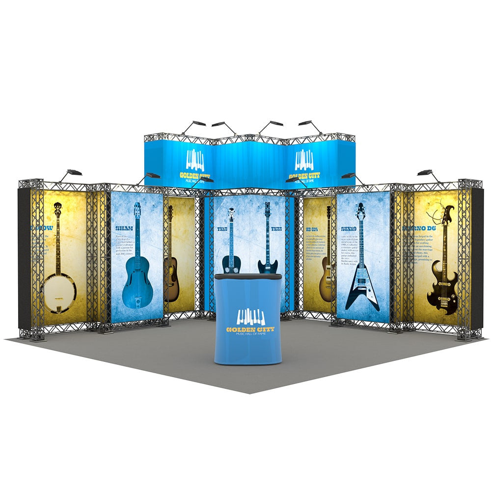 - Designed to fit in a 20ft x 20ft booth space. Please check your trade show guidelines to make sure this configuration conforms to the show regulations.